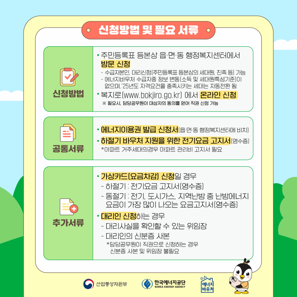 - 필수: 에너지이용권 신청서, 전기요금 고지서